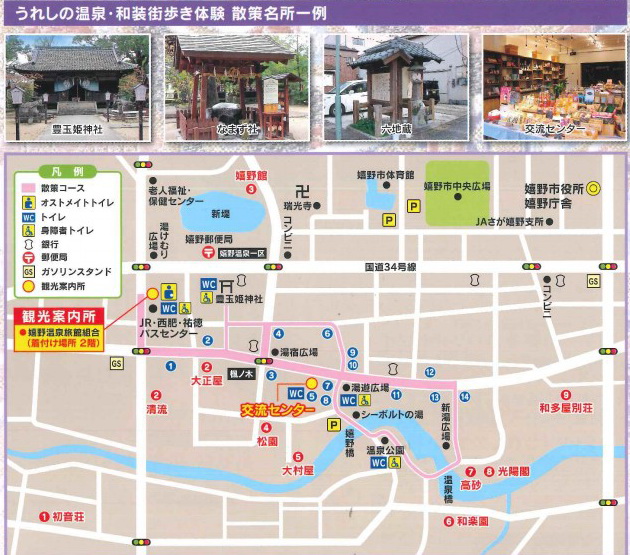 和服換裝地點為嬉野溫泉巴士中心 觀光案內所的2樓,時間為10:00~16:00,最後歸還時間為17:30,特別提醒此次活動沒有提供小孩的和服租借服務。和服漫步活動優惠店家分布在嬉野溫泉街上,從觀光案內所直到新湯廣場,正好遊覽美肌神社─豐玉姬神社,或是在湯宿廣場、西博爾德足湯歇歇腿,一邊吃吃喝喝,拍下美美的和服紀念照吧~😍